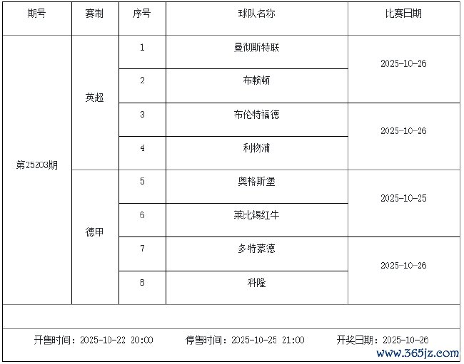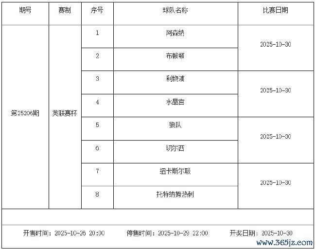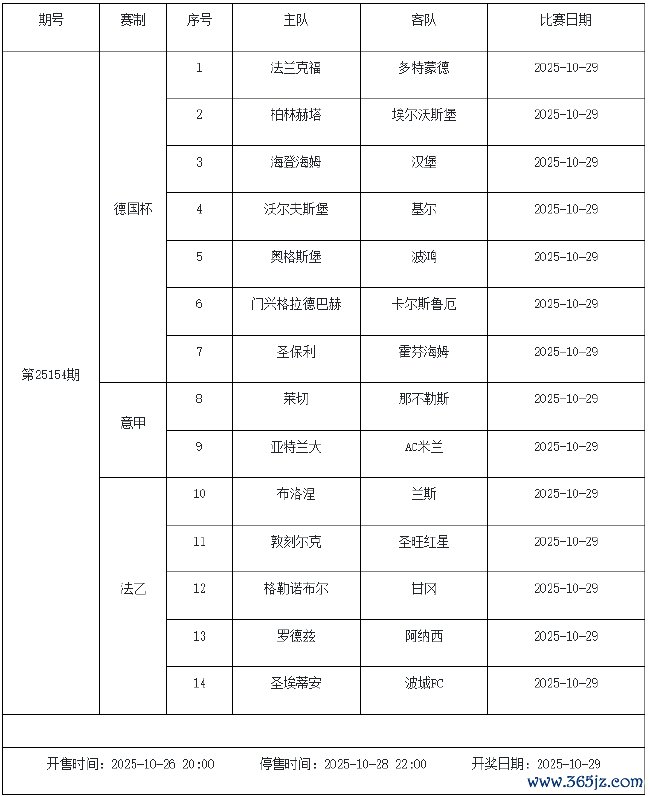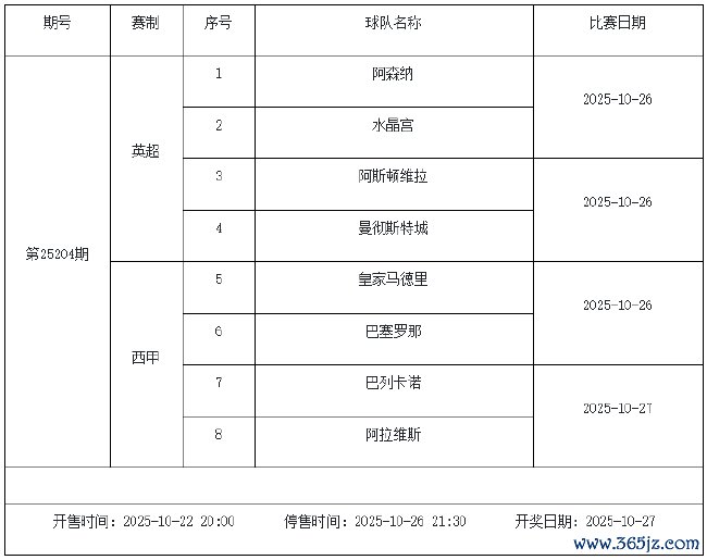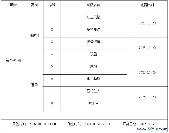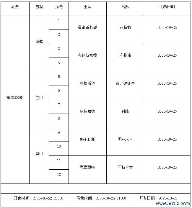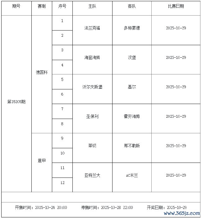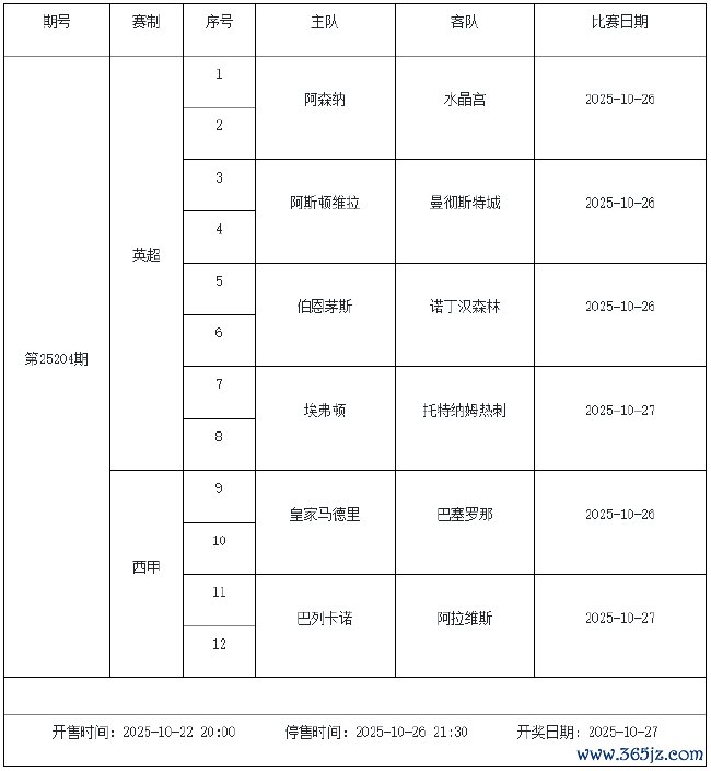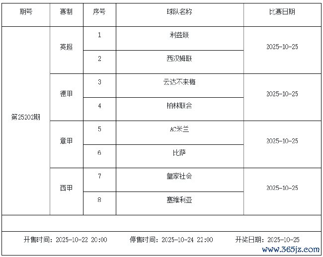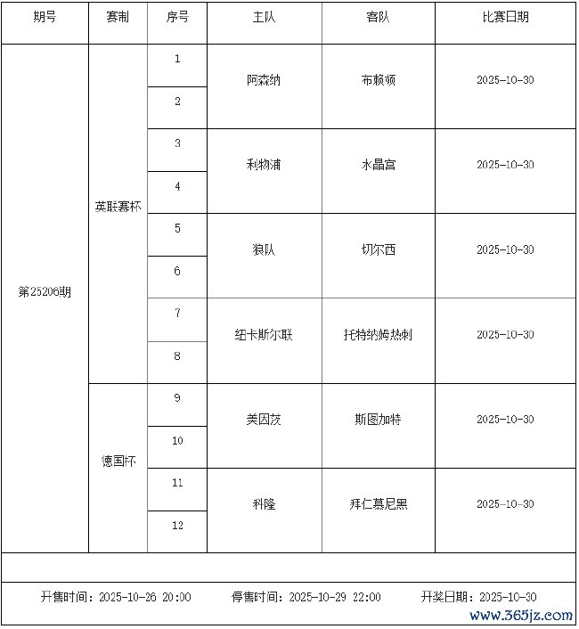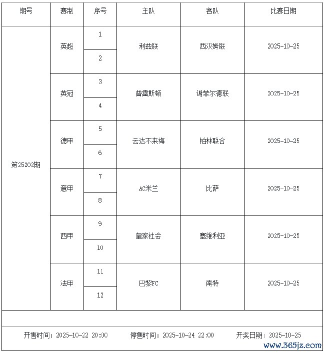 我中心制定了2025年中国足球彩票输赢游戏(14场、任选9场)、6场半全场输赢游戏和4场进球游戏10月24日-10月30日的竞猜场次安排(具体附后),其竞猜对象、开售时代、停售时代和计奖时代均以本文为准。