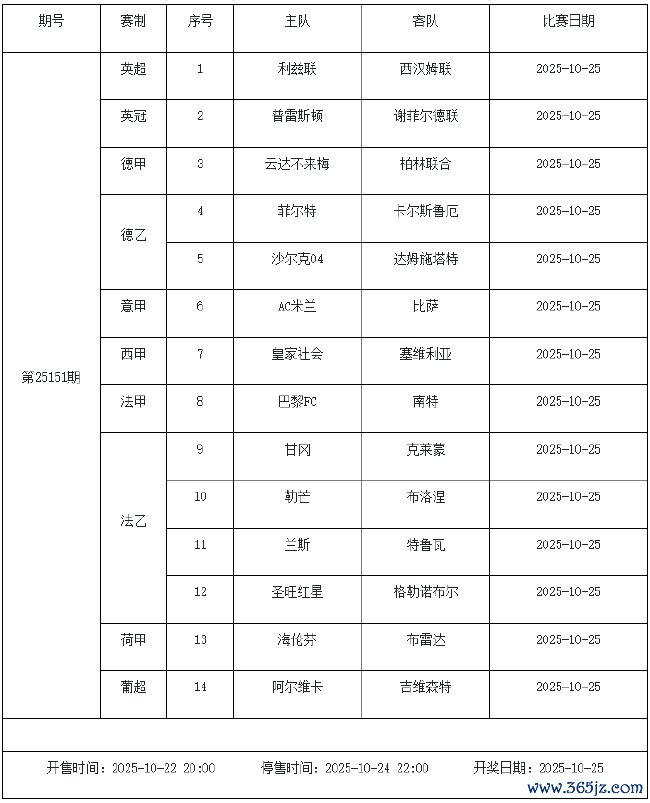 附件1. 足球彩票输赢游戏(14场和任选9场)第25151期