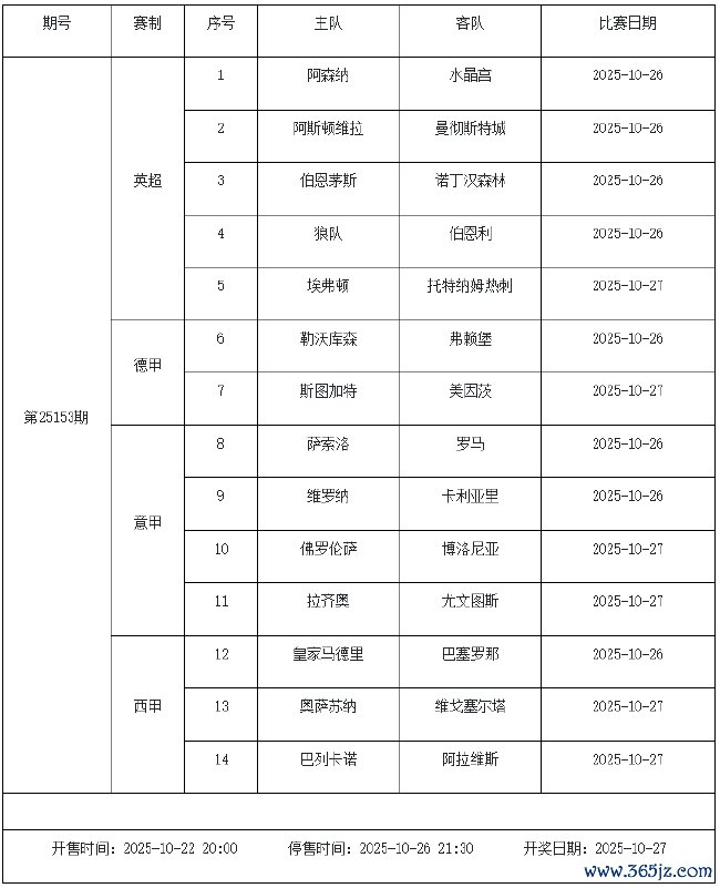 附件3. 足球彩票输赢游戏(14场和任选9场)第25153期